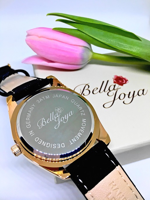 Die schöne Armbanduhr hat ein original japanisches MIYOTA-Qualitätsquarzwerk, ihr Armband ist in feinster Handarbeit hergestellt worden und hat einen stylischen Samteffekt. Die Uhr sieht sehr edel und elegant aus und wird mit einem Echtheitszertifikat von „Bella Joya“ und einer hübschen Uhrenbox geliefert.